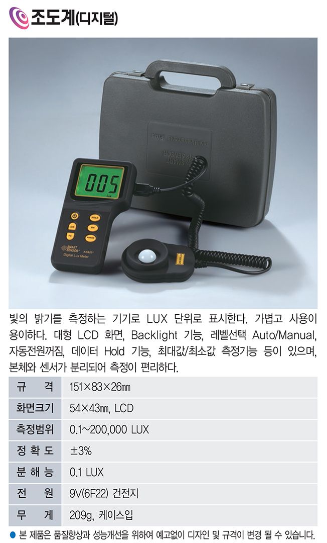 품명 디지털 조도계는 0.1~200,000 LUX 범위를 정밀 측정하며 센서 분리형 구조와 대형 LCD로 편리성을 높였습니다. 백라이트·홀드·최대/최소값 기능을 갖춘 실용적인 조도측정기입니다.