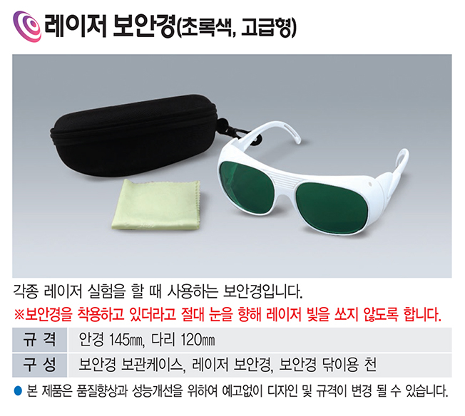 품명 고급형 레이저 보안경은 초록색 렌즈로 특정 파장의 레이저 빛을 효과적으로 차단해 눈을 보호합니다. 가벼운 착용감과 보관 케이스 포함으로 실험실·연구실·교육기관에서 안전한 레이저 실험에 필수적인 보호안경입니다.