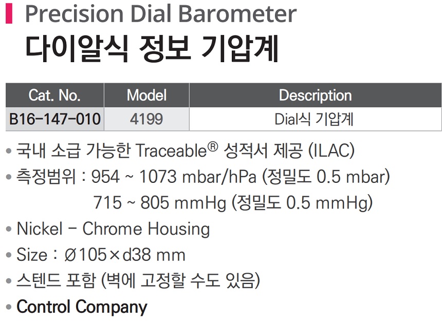 품명 ■ 국내 소급 가능한 Traceable® 성적서 제공 (ILAC) ■ 측정 범위 : 954 ~ 1073 mbar/hPa (정밀도 0.5 mbar) 715 ~ 805 mmHg (정밀도 0.5 mmHg) ■ Nickel - Chrome Housing ■ Size : Ø105×d38 mm ■ 스탠드 포함 (벽에 고정할수도 있음) ■ Control Company