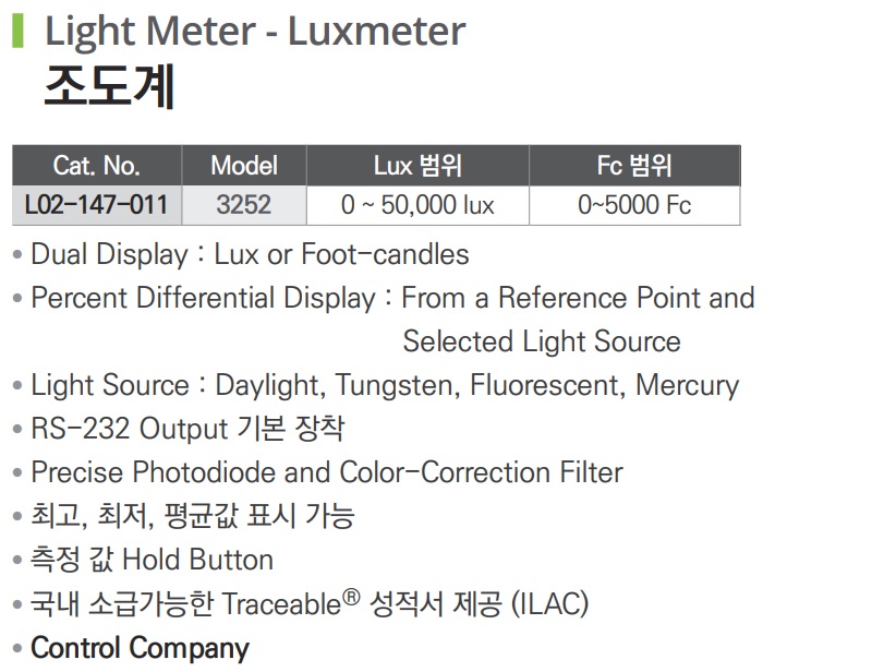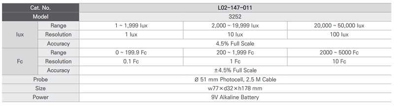 | L02-147-011 | 3252 | 0 ~ 50,000 lux | 0~5000 Fc |