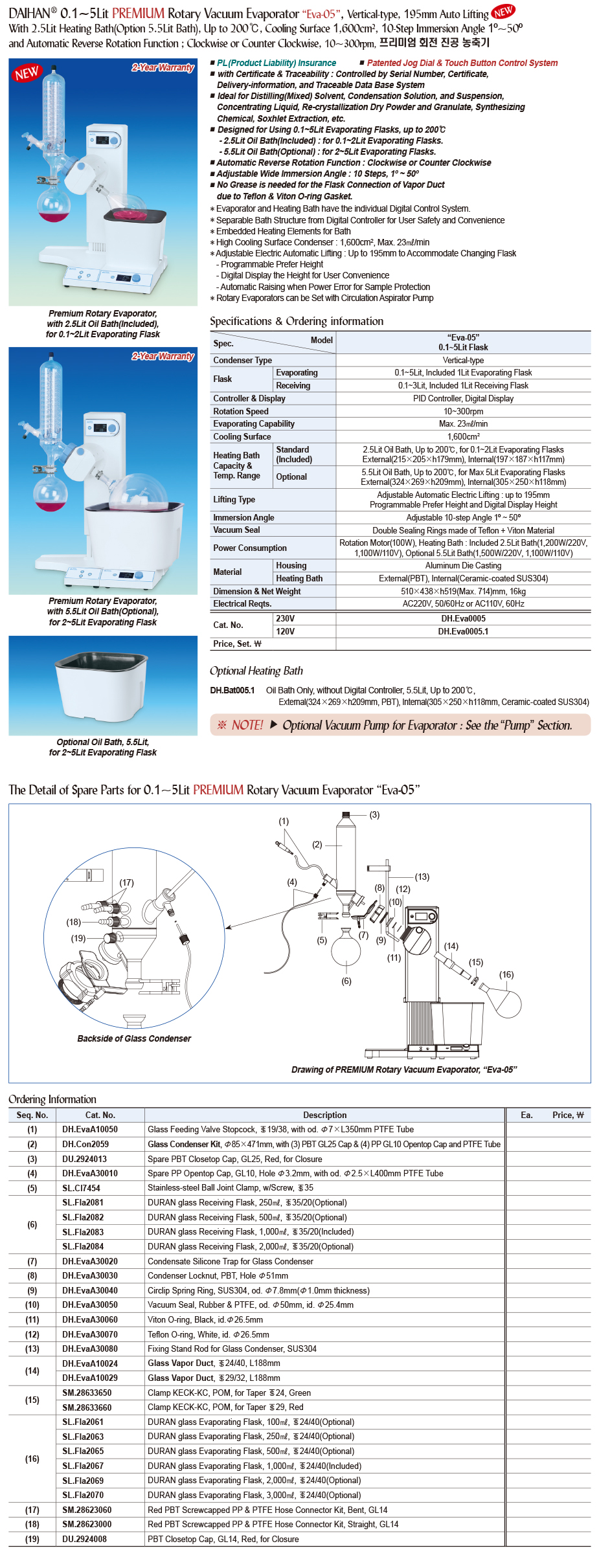 0.1~5Lit PREMIUM Rotary Vacuum Evaporator “Eva-05” , Vertical-type, 195mm Auto LiftingWith 2.5Lit Heating Bath(Option 5.5Lit Bath), Up to 200℃, Cooling Surface 1,600cm 2 , 10-Step Immersion Angle 1º~50ºand Automatic Reverse Rotation Function ; Clockwise or Counter Clockwise, 10~300rpm