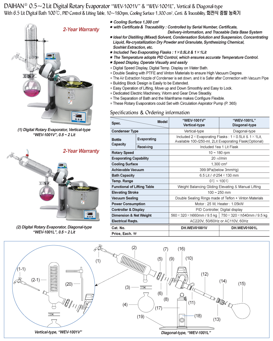 0.5~2Lit Digital Rotary Evaporator “WEV-1001V” & “WEV-1001L” , Vertical & Diagonal-typeWith 6.5 Lit Digital Bath 100℃, PID Control & Lifting Table, 10~180rpm, Cooling Surface 1,300 cm 2 , Certi. & Traceability