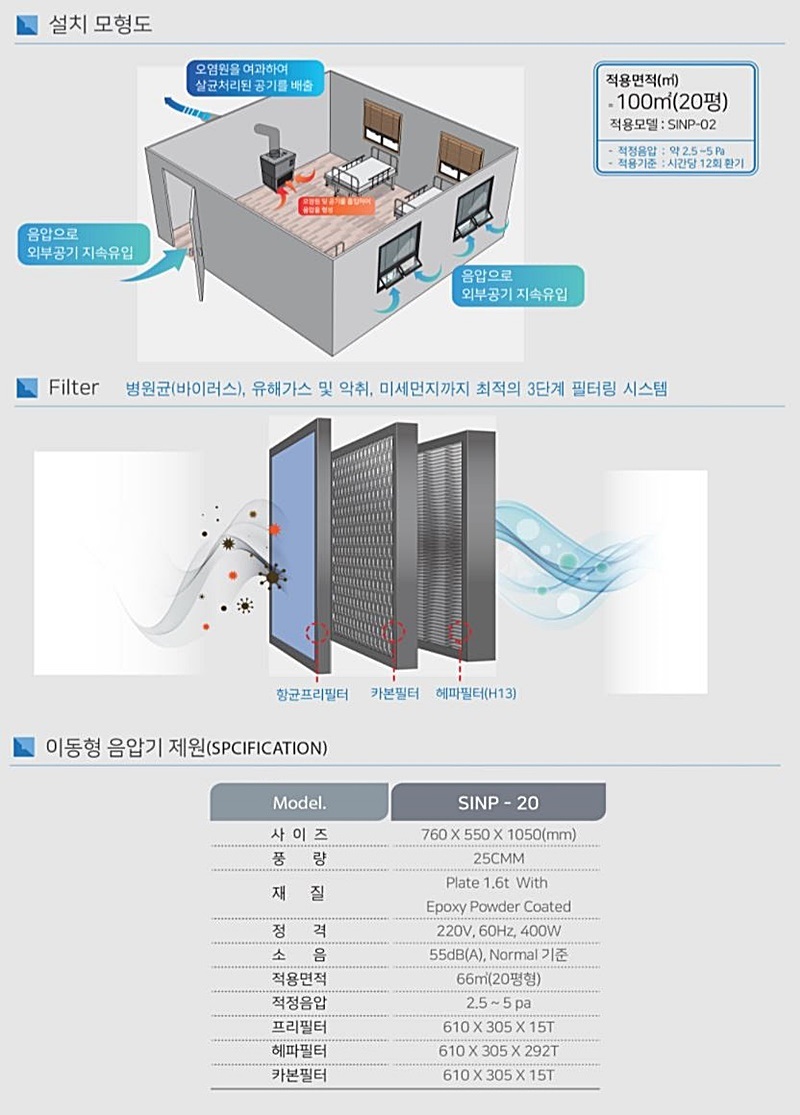 중형 이동식 음압장치 SINP-20 음압병상 음압시설 음압병동 이동형 음압기