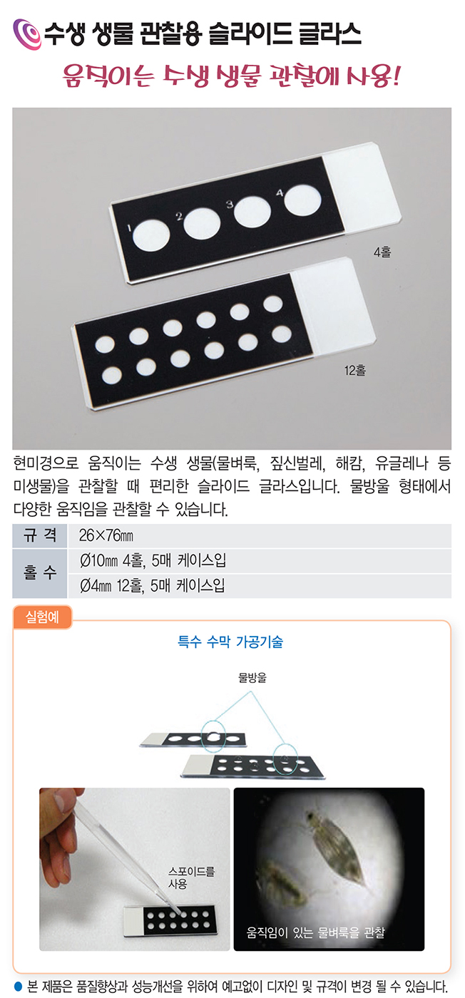 품명 현미경으로 움직이는 수생 생물을 관찰할 때 편리한 슬라이드 글라스입니다. 물방울 형태에서 다양한 움직임을 관찰할 수 있습니다.