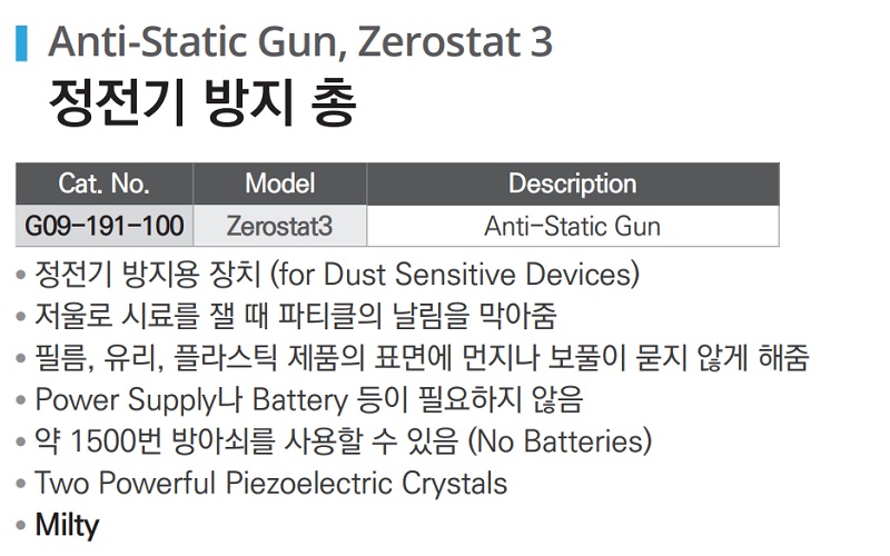 품명 ■ 정전기 방지용 장치 (for Dust Sensitive Devices) ■ 저울로 시료를 젤때 파티클의 날림을 막아줌 ■ 필름, 유리, 플라스틱 제품의 표면에 먼지나 보풀이 묻지 않게 해줌 ■ Power Supply나 Battery 등이 필요하지 않음 ■ 약 50,000번 방아쇠를 사용할 수 있음 (No Batteries) ■ Two Powerful Piezoelectric Crystals ■ Milty
