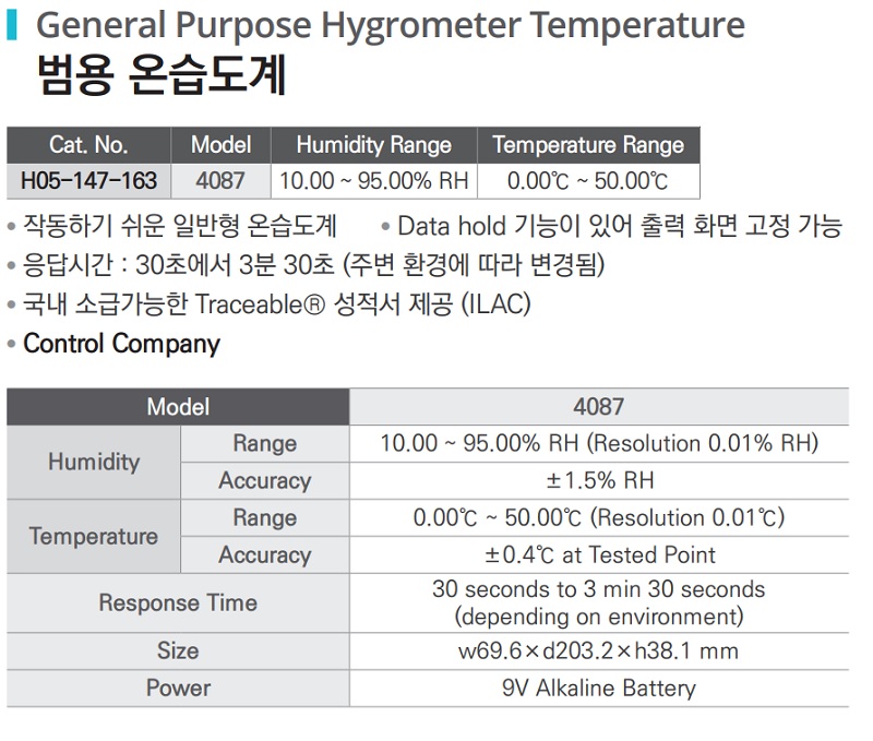 품명 ■ 작동하기 쉬운 일반형 온습도계 ■ Data hold 기능이 있어 출력 화면 고정 가능 ■ 응답시간 : 30초 에서 3분 30초 ( 주변 환경에 따라 변경 되어짐 ) ■ 국내 소급가능한 Traceable® 성적서 제공 (ILAC) ■ Control Company