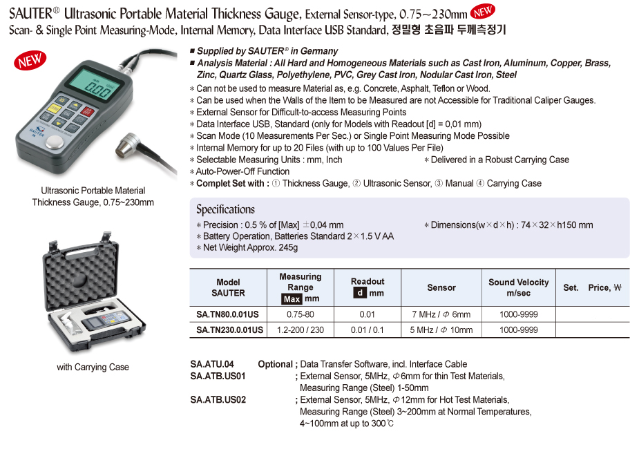 SAUTER® Ultrasonic Portable Material Thickness Gauge, External Sensor-type, 0.75~230mmScan- & Single Point Measuring-Mode, Internal Memory, Data Interface USB Standard