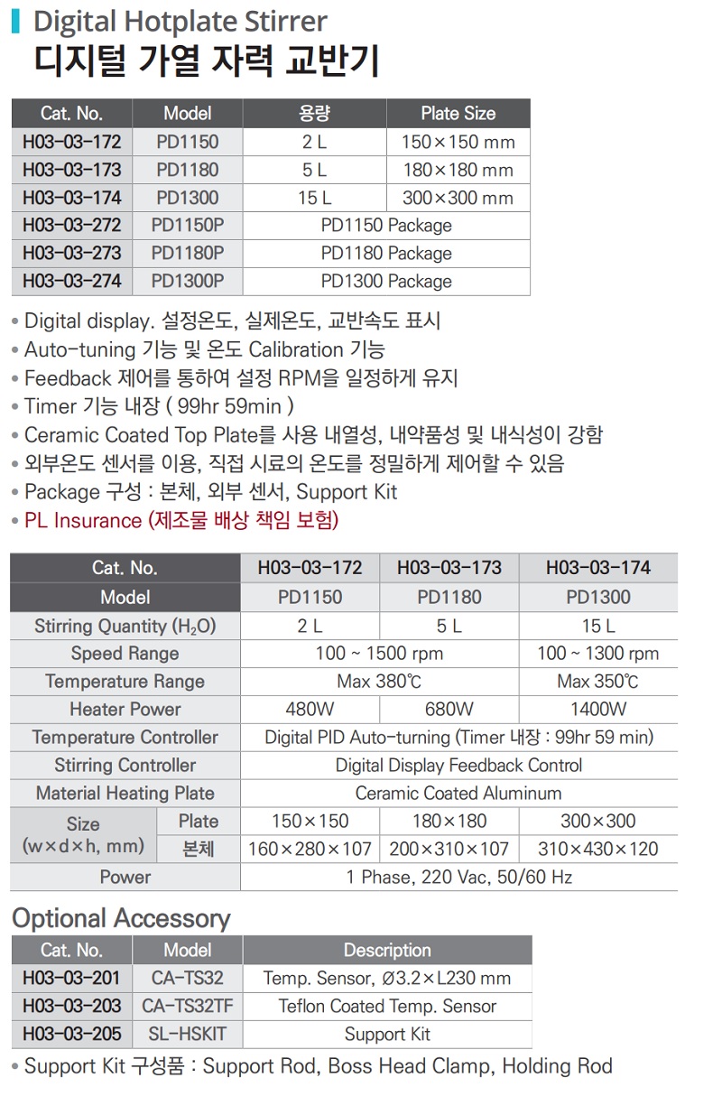 품명 ■ Digital display. 설정온도, 실제온도, 교반속도 표시 ■ Auto-tuning 기능 및 온도 Calibration 기능 ■ Feedback 제어를 통하여 설정 RPM을 일정하게 유지 ■ Timer 기능 내장 (99hr 59min) ■ Ceramic Coated Top Plate를 사용 내열성, 내약품성 및 내식성이 강함 ■ 외부온도 센서를 이용, 직접 시료의 온도를 정밀하게 제어할 수 있음 ■ Package 구성 : 본체, 외부 센서,