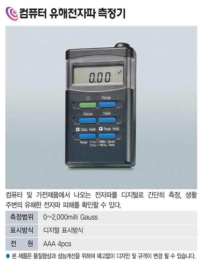 컴퓨터 유해전자파 측정기는 생활 주변에서 발생하는 전자파를 디지털 방식으로 간편하게 측정할 수 있는 휴대용 측정기입니다.