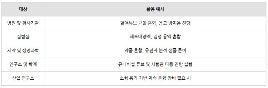 혈액 샘플, 점성 시료, 배양액 등 혼합이 어려운 시료를 부드럽게 균질화할 수 있어 생명과학, 병리학, 화학 실험 등 폭넓은 분야에 활용됩니다.