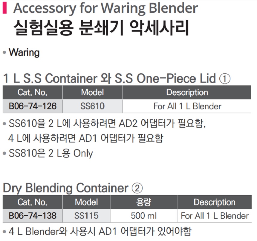 • ● 4 L Blender와 사용시 AD1 Adapter가 있어야함