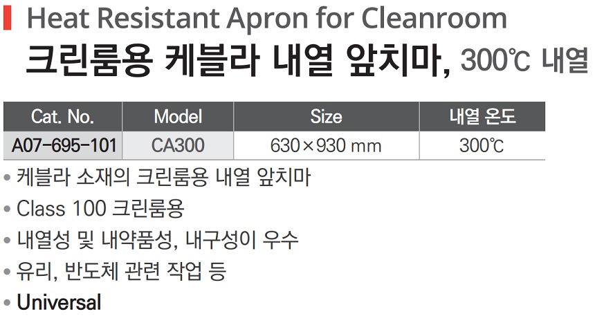 품명 ■ 케블라 소재의 크린룸용 내열 앞치마 ■ Class 100 크린룸용 ■ 내열성 및 내약품성, 내구성이 우수 ■ 유리, 반도체 관련 작업 등 ■ Universal