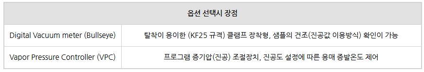 선택 사양으로 디지털 진공계, 증기압 컨트롤러 등을 추가 구성하여 정밀한 진공 건조 환경 구축이 가능합니다.