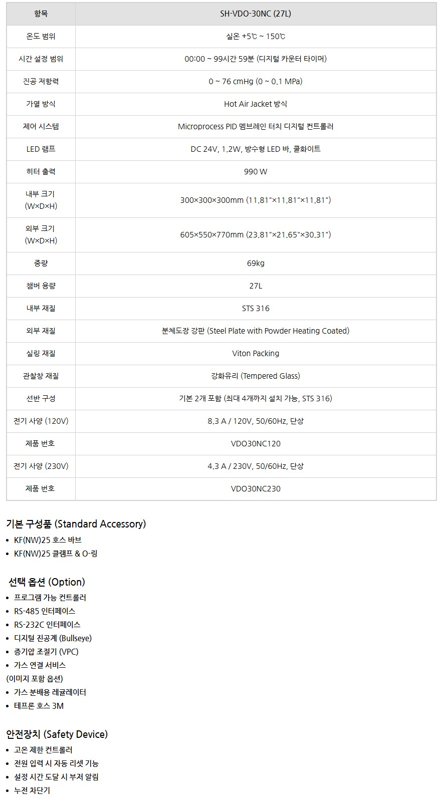 유기용매 진공 건조기 유기화합물 건조용 진공 오븐 SH-VDO-30NC (27L)