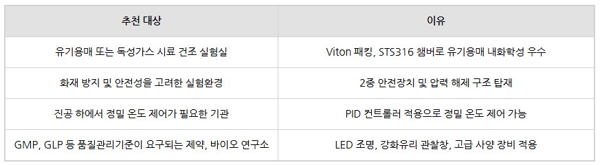 챔버 내부는 STS 316 스테인리스 재질로 제작되었으며, 바이톤(Viton) 패킹을 적용하여 유기용매에 대한 내화학성을 크게 강화했습니다.
