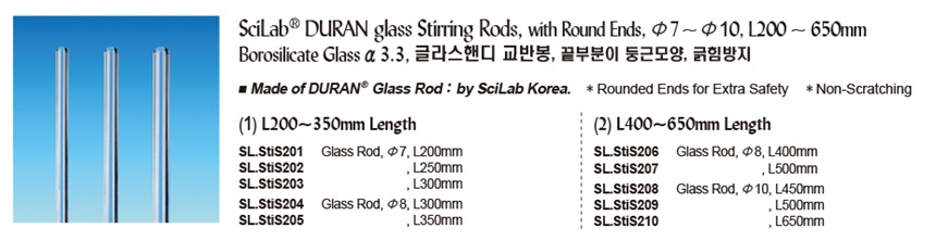 SciLab® DURAN glass Stirring Rods, with Round Ends, Φ7 ~ Φ10, L200 ~ 650mm Borosilicate Glassα3.3, 글라스핸디 교반봉, 끝부분이 둥근모양, 긁힘방지