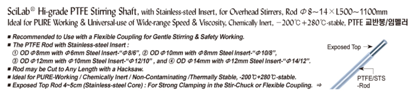 SciLab® Hi-grade PTFE Stirring Shaft, with Stainless-steel Insert, for Overhead Stirrers, Rod Φ8~14×L500~1100mmIdeal for PURE Working & Universal-use of Wide-range Speed & Viscosity, Chemically Inert, -200℃+280℃-stable, PTFE 교반봉/임펠러