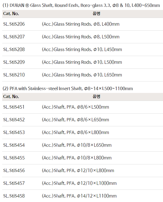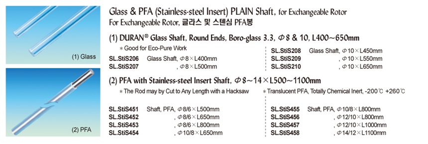 Glass & PFA (Stainless-steel Insert) PLAIN Shaft, for Exchangeable RotorFor Exchangeable Rotor, 글라스 및 스텐심 PFA 봉
