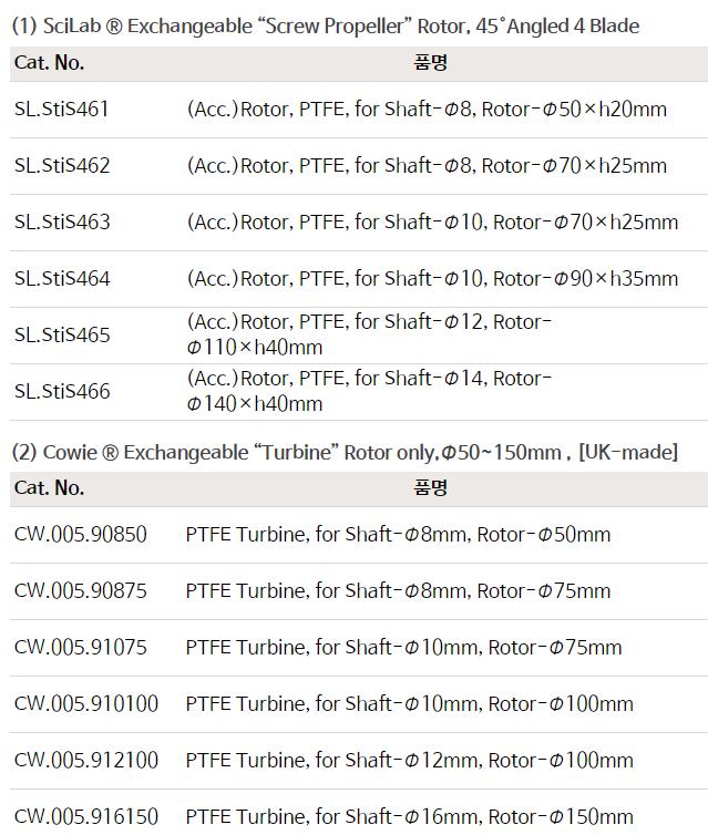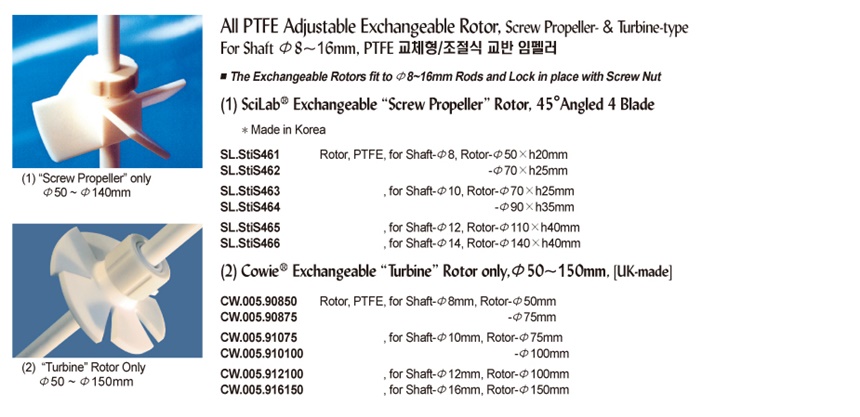 All PTFE Adjustable Exchangeable Rotor, Screw Propeller- & Turbine-typeFor Shaft Φ8~16mm, PTFE 교체형/조절식 교반 임펠러