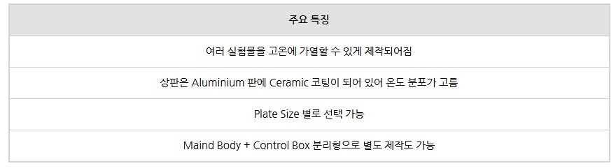상판에는 알루미늄 판에 세라믹 코팅을 적용하여 높은 온도 전달력과 열분포 균일성을 제공하며, 최대 300℃까지 온도 조절이 가능합니다.