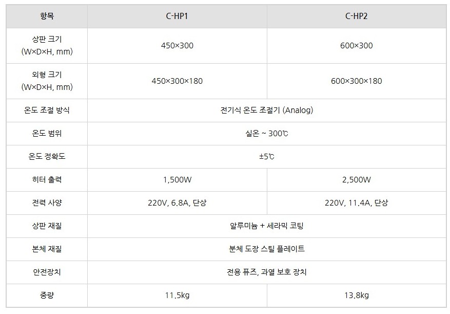 판 사이즈는 실험 목적에 따라 선택할 수 있도록 두 가지 모델(C-HP1: 450×300mm / C-HP2: 600×300mm)로 구성되어 있습니다.