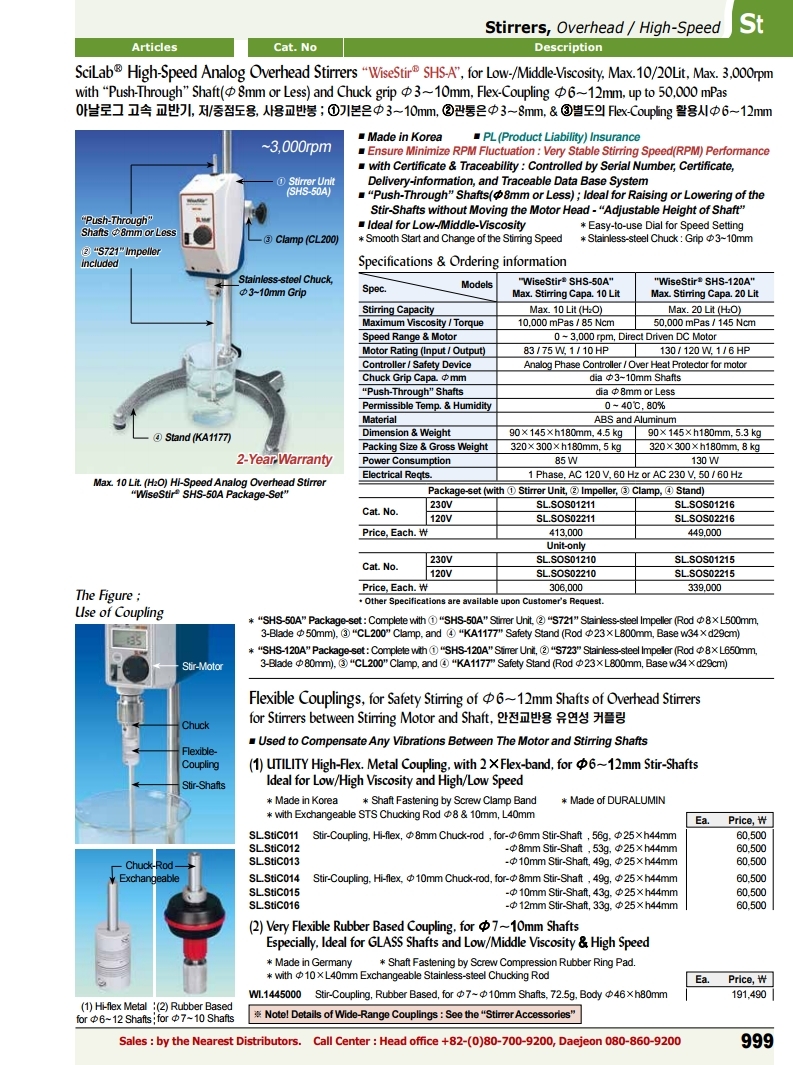 SciLab® High-Speed Analog Overhead Stirrers “WiseStir® SHS-A”, for Low-/Middle-Viscosity, Max.10/20Lit, Max. 3,000rpm with “Push-Through” Shaft(Φ8mm or Less) and Chuck grip Φ3~10mm, Flex-Coupling Φ6~12mm, up to 50,000 mPas