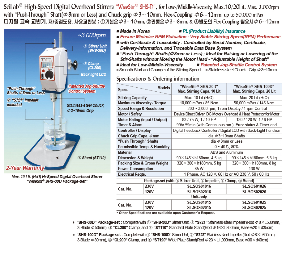 SciLab® High-Speed Digital Overhead Stirrers “WiseStir® SHS-D”, for Low-/Middle-Viscosity, Max.10/20Lit, Max. 3,000rpm with “Push-Through” Shaft(Φ8mm or Less) and Chuck grip Φ3~10mm, Flex-Coupling Φ6~12mm, up to 50,000 mPas 디지털 고속 교반기, 저/중점도용, 사용교반봉 ; ①기본은Φ3~10mm, ②관통은Φ3~8mm, & ③별도의 Flex-Coupling 활용시Φ6~12mm