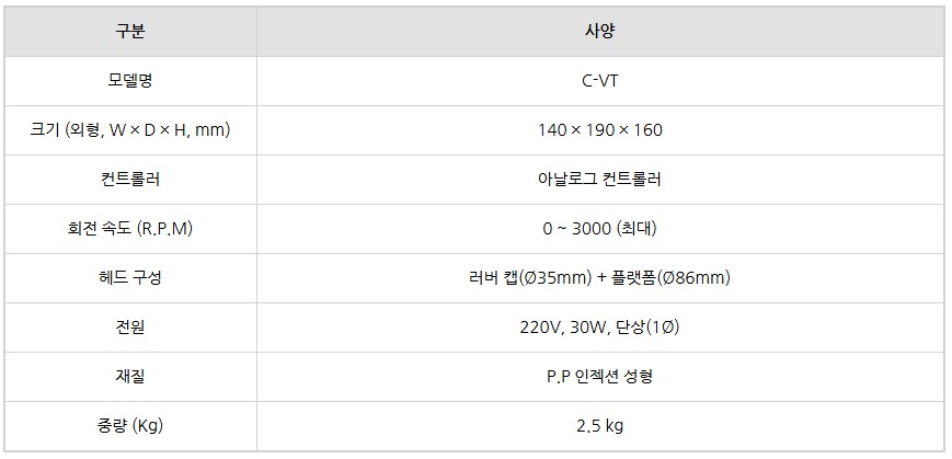 최대 3000RPM 고속 회전 성능과 2가지 헤드(Ø35mm Rubber Cap, Ø86mm Platform) 제공으로