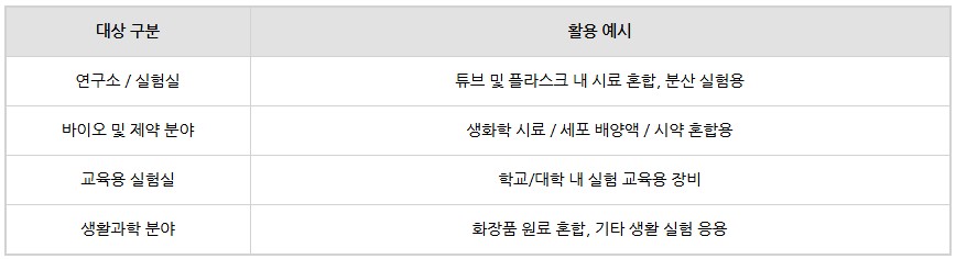 임상실험실, 생화학 실험, 생활과학 실험 등에서 튜브·플라스크 내 소량의 시료를 빠르고 균일하게 혼합(Mixing)하기 위해 설계된 제품입니다.