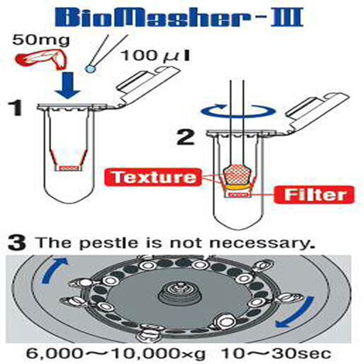 * Put samples into filter tube and insert pestle. Grinding samples by pestle by hand or motorized rotater named "Power Masher II". After that, centrifuge at 6,000 to 10,000 x g for 10 to 30 sec.