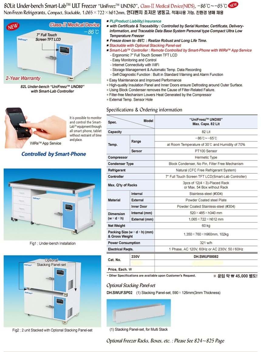 80Lit Under-bench Smart-Lab TM ULT Freezer “UniFreez TM UND80” , Class-Ⅱ Medical Device(NIDS), -86℃~-65℃ NEWNon-Freon Refrigerants, Compact, Stackable, 1,065×722×h612mm, 언더벤치 초저온 냉동고, 적재사용 가능, 친환경 냉매 채용