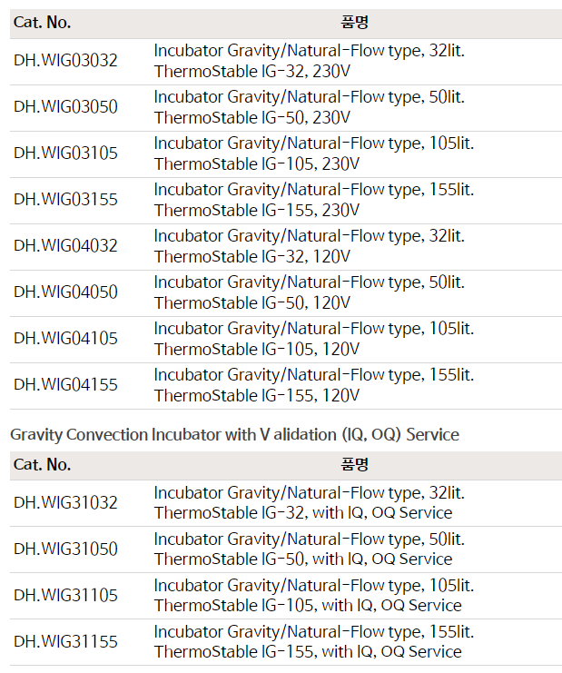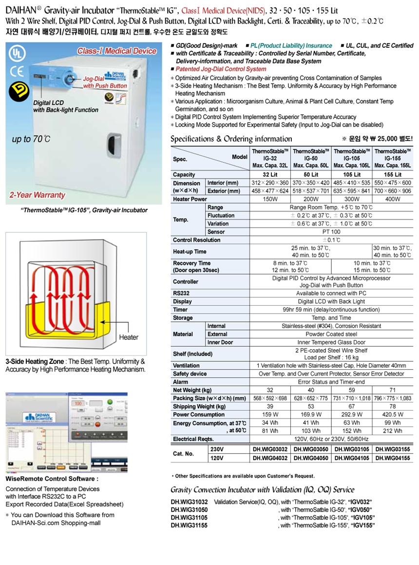 DAIHAN® Gravity-air Incubator “ThermoStable TM IG” , ClassⅠ Medical Device(NIDS), 32·50·105·155 LitWith 2 Wire Shelf, Digital PID Control, Jog-Dial & Push Button, Digital LCD with Backlight, Certi. & Traceability , up to 70℃, ±0.2℃자연 대류식 배양기/인큐베이터, 디지털 퍼지 컨트롤, 우수한 온도 균일도와 정확도
