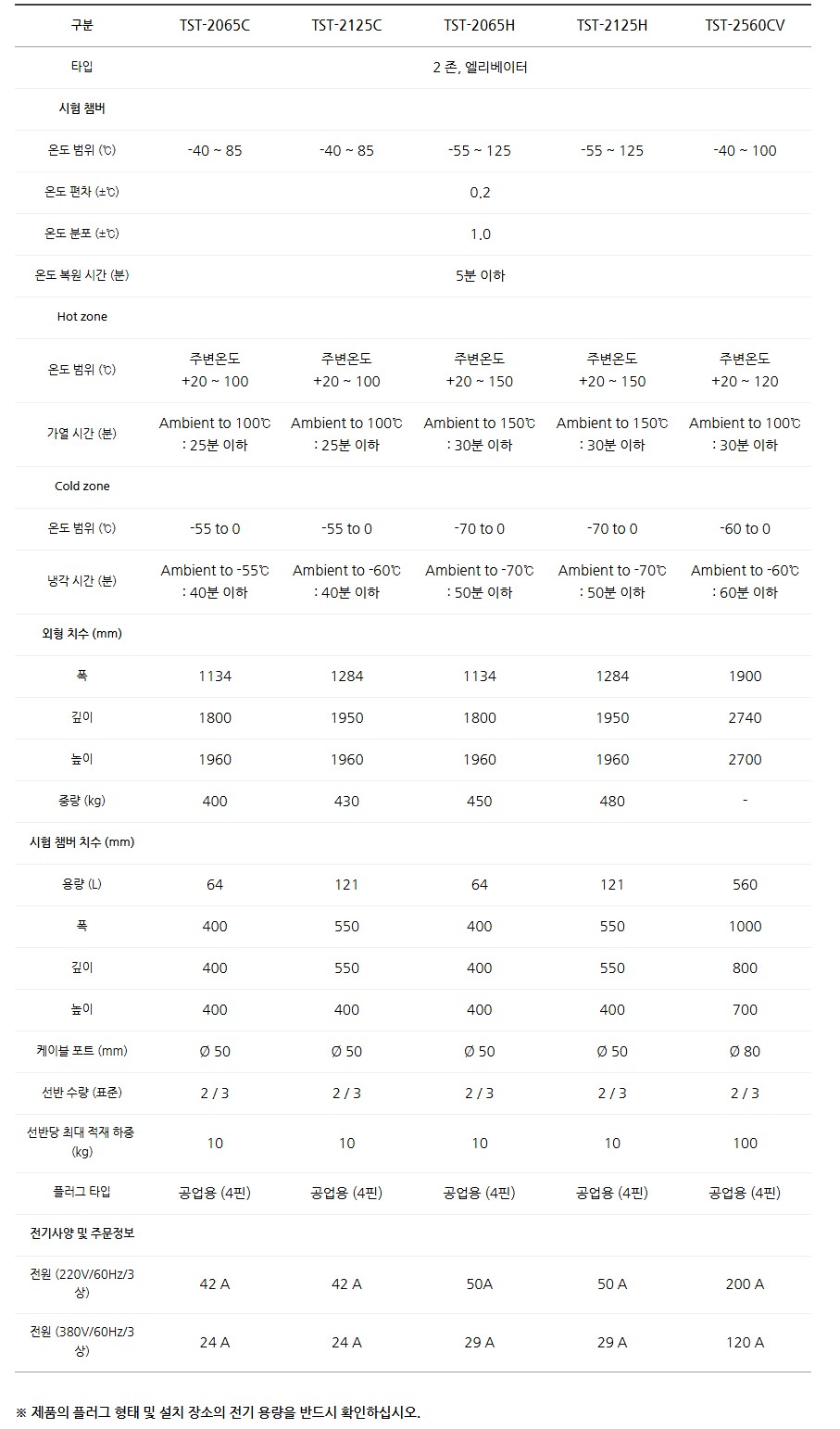 고온 및 저온 챔버가 상하 혹은 좌우로 분리된 2존, 3존 시스템으로 구성됩니다.