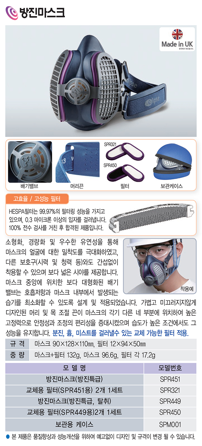 개요 : 소형화, 경량화 및 우수한 유연성을 통해 얼굴에 대한 밀착도를 극대화하였고, 다른 보호구(시력 및 청력 등)와도 간섭 없이 착용할 수 있으며 보다 넓은 시야를 제공합니다. 마스크 중앙에 위치한 보다 대형화된 배기밸브는 호흡저항과 마스크 내부에서 발생되는 습기를 최소화할 수 있도록 설계 및 적용되었습니다. 가볍고 미끄러지지 않게 디자인된 머리 및 목 조절 끈이 마스크의 각기 다른 네 부분에 위치하여 높은 고정력으로 안정성과 조정의 편리성을 증대시켰으며 습도가 높은 조건에서도 그 성능을 유지합니다. 분진, 흄, 미스트를 걸러낼 수 있는 교체 가능한 필터 적용. HESPA필터는 99.97%의 필터링 성능을 가지고 있으며, 0.3 마이크론 이상의 입자를 걸러냅니다. 100% 전수 검사를 거친 후 합격된 제품입니다.