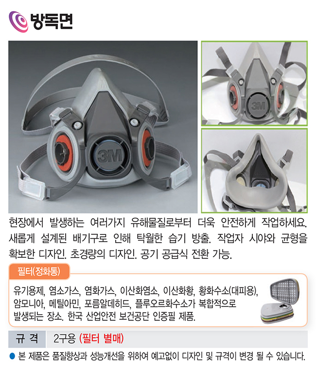 품명 코드번호 : VLS-4460 품명 : 방독면 개요 : 새롭게 설계된 배기구로 인해 탁월한 습기 방출. 작업자 시야와 균형을 확보한 디자인. 초경량의 디자인. 공기 공급식 전환 가능.