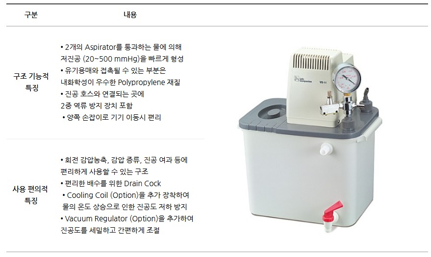 전기식 아스피레이터 VE-11은 감압흡착, 진공증류, 진공여과 등의 실험에서 사용되는 전기식 감압 장치입니다.