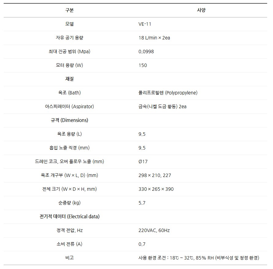 품명 전기식 아스피레이터 VE-11, 18L 용량과 2중 역류 방지 장치 포함. 연구실, 제약·식품 실험에 최적화된 감압 장치.