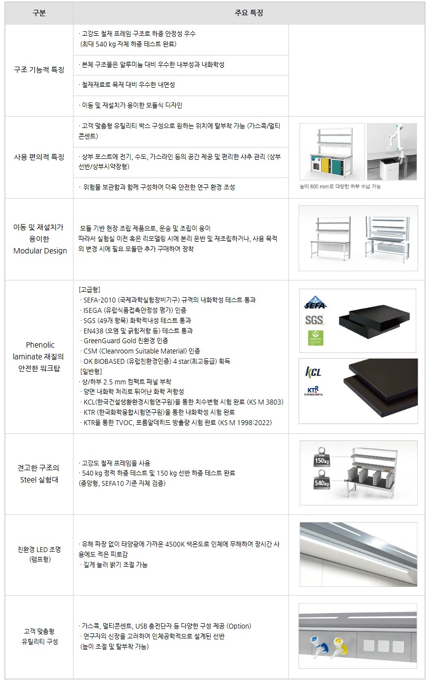 품명 SEFA10 인증 고하중 철제 실험대 모듈형 구성으로 다양한 실험실 환경에 최적화된 벽면형 코너형 선택 가능