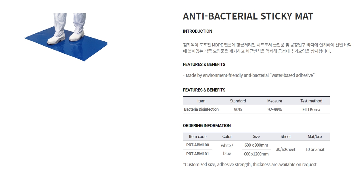 점착액이 도포된 MAPE 필름에 향균처리된 시트로서 클린룸 및 공정입구 바닥에 설치하여