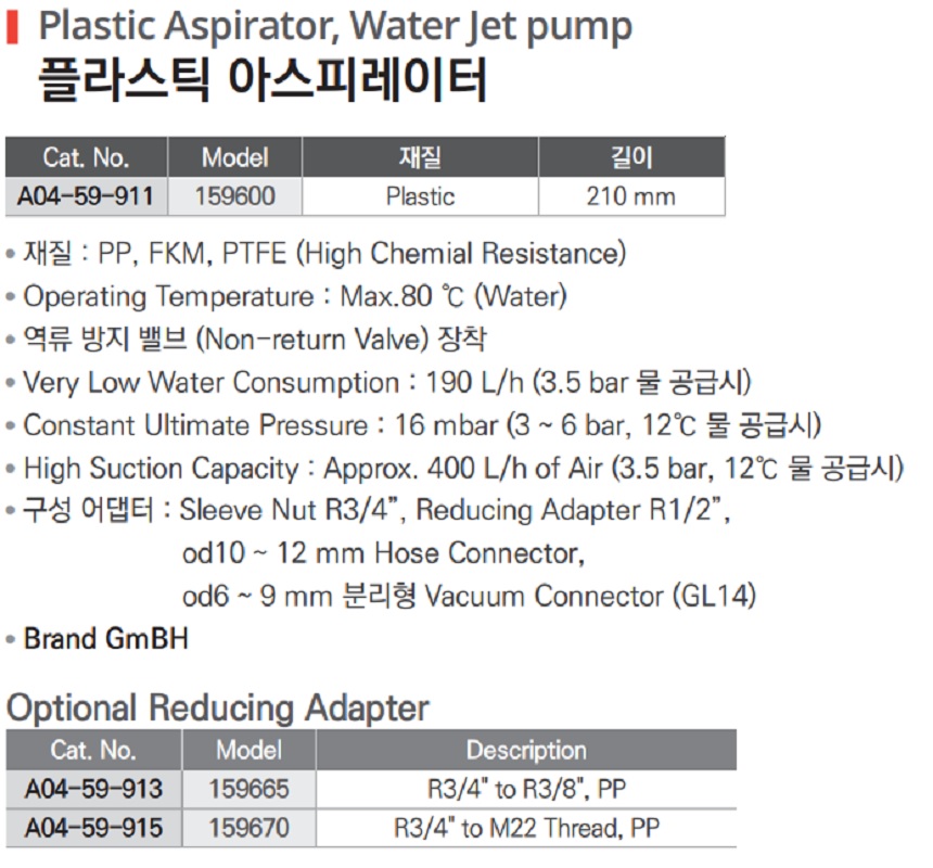 플라스틱 아스피레이터 Plastic Aspirator, Water Jet pump, A04-59-911