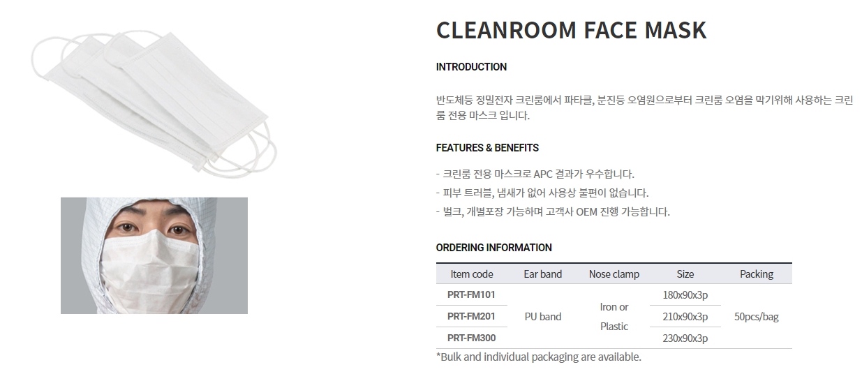 품명 반도체등 정밀전자 크린룸에서 파타클, 분진등 오염원으로부터 크린룸 오염을 막기위해 사용하는 크린룸 전용 마스크 입니다.