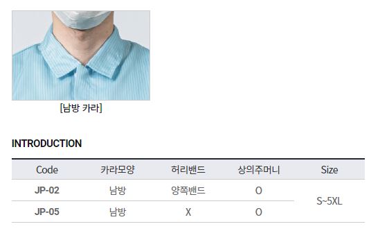 품명 크린룸 또는 일반 작업라인에서 착용하는 상/하의 분리형 작업복으로 착용감 및 활동성이 편리합니다