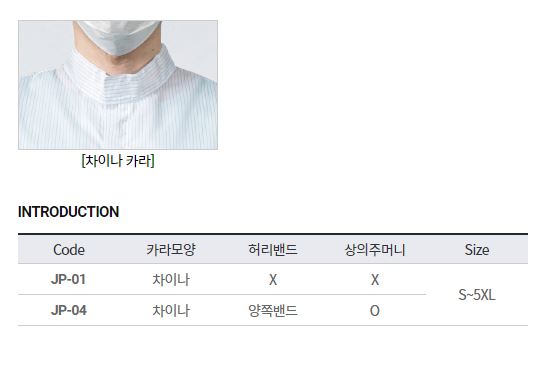 원피스 방진복에 비해 Particle 발생률이 높으나, 배출 최소화를 위해 차이나형 카라를 적용 할 수 있습니다