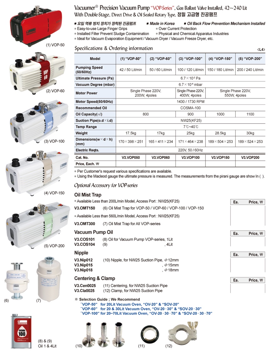 Vacuumer® Precision Vacuum Pump “VOP-Series” , Gas Ballast Valve Installed, 42~240 LitWith Double-Stage, Direct Drive & Oil Sealed Rotary Type, 정밀 고급형 진공펌프