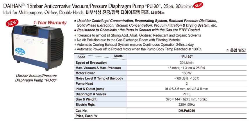 DAIHAN® 15mbar Anticorrosive Vacuum/Pressure Diaphragm Pump “PU-30” , 25psi, 30Lit/minIdeal for Multi-purpose, Oil-free, Double Heads, 내부식성 진공/압력 다이어프램 펌프, 더블헤드