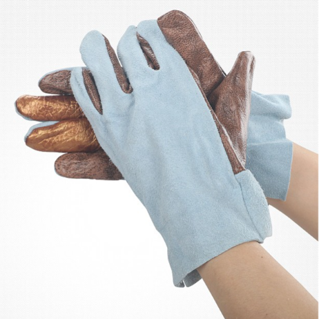 ■손바닥 부분을 쇼파가죽(스플릿가죽(Split Leather-가죽의 모공이 보이는 표면(은면)이 있는 층과 그 아래 층을 나눌때 두번째 층이기에 세컨드 레이어 (Second Layer)라고도 부름)으로 제작하여 가격이 저렴하고 은면이 없기때문에 인위적으로 여러 무늬를 입혀 표면에 코팅을 해서 가공하여 코팅가죽이라고 함)으로 만들어서 사용 시 편리하여 용접 및 작업용으로도 많이 쓰임니다
