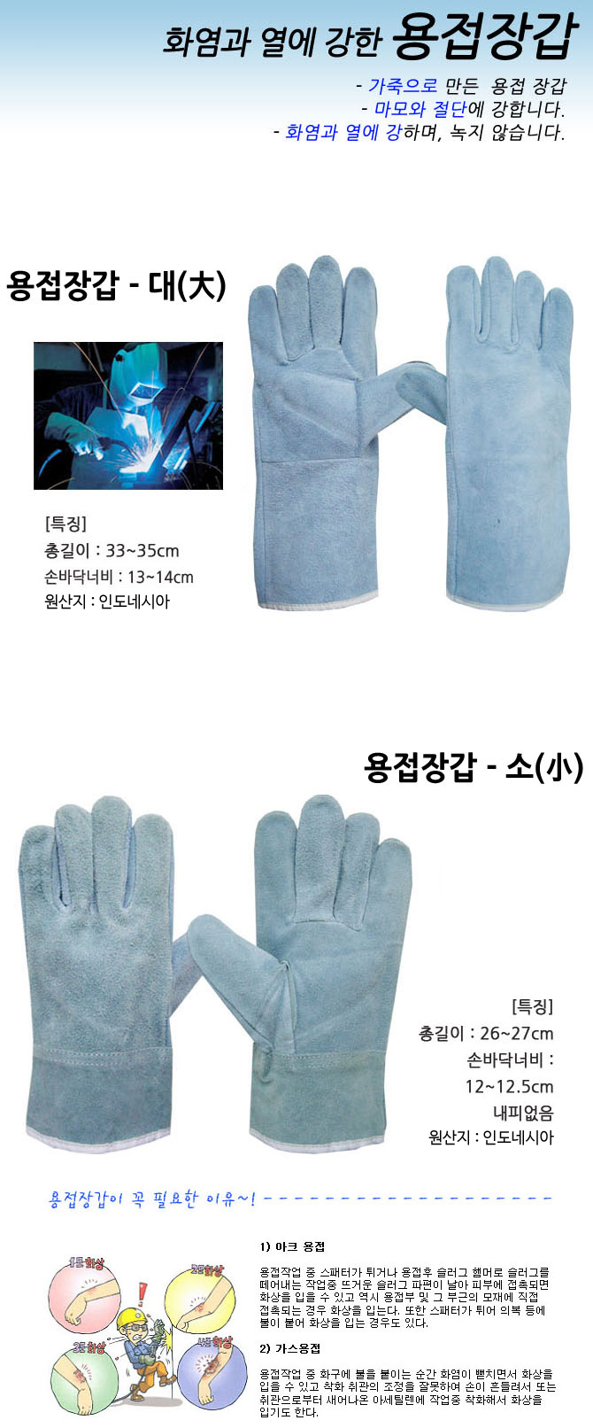 품명 ■ 가죽으로 만든 용접장갑 ■ 마모와 절단에 강함 ■ 화염과 열에 강하며, 녹지 않음