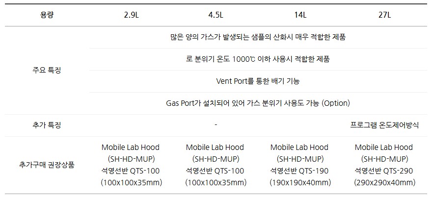 또한 고온에서도 장비 보호 및 실험 안정성을 높이기 위한 추가 옵션 제품(모바일 랩후드, 석영선반 등)도 함께 제공됩니다.