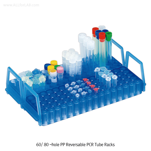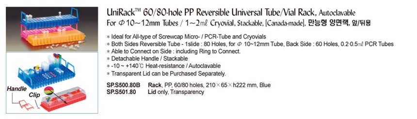 UniRack TM 60/80-hole PP Reversible Universal Tube/Vial Rack, AutoclavableFor Φ10~12mm Tubes / 1~2㎖ Cryovial, Stackable, [ Canada-made ] , 만능형 양면랙, 앞/뒤용