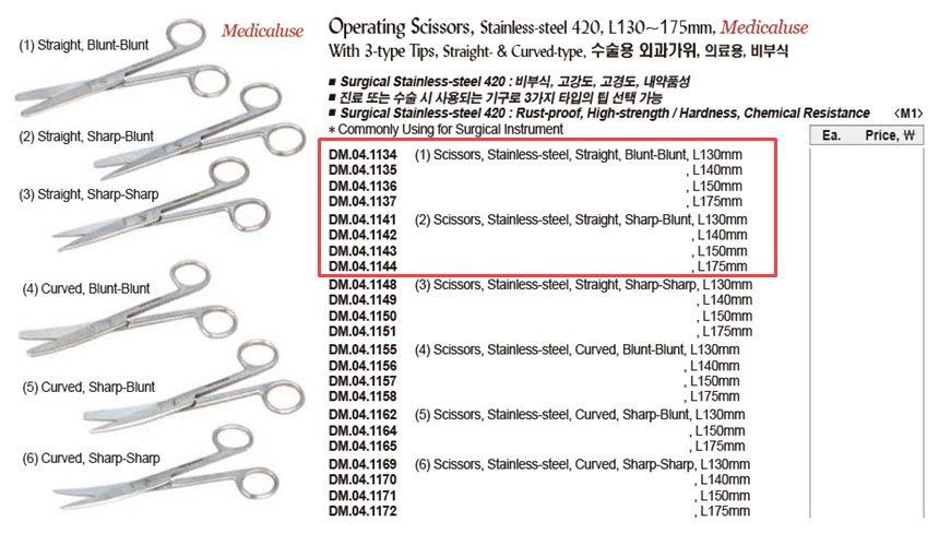 품명 수술용 외과가위, 의료용, 비부식 Straight/Stainless-steel